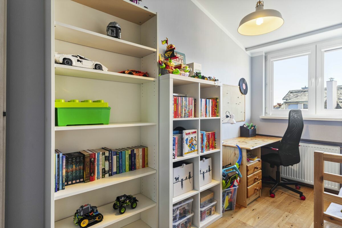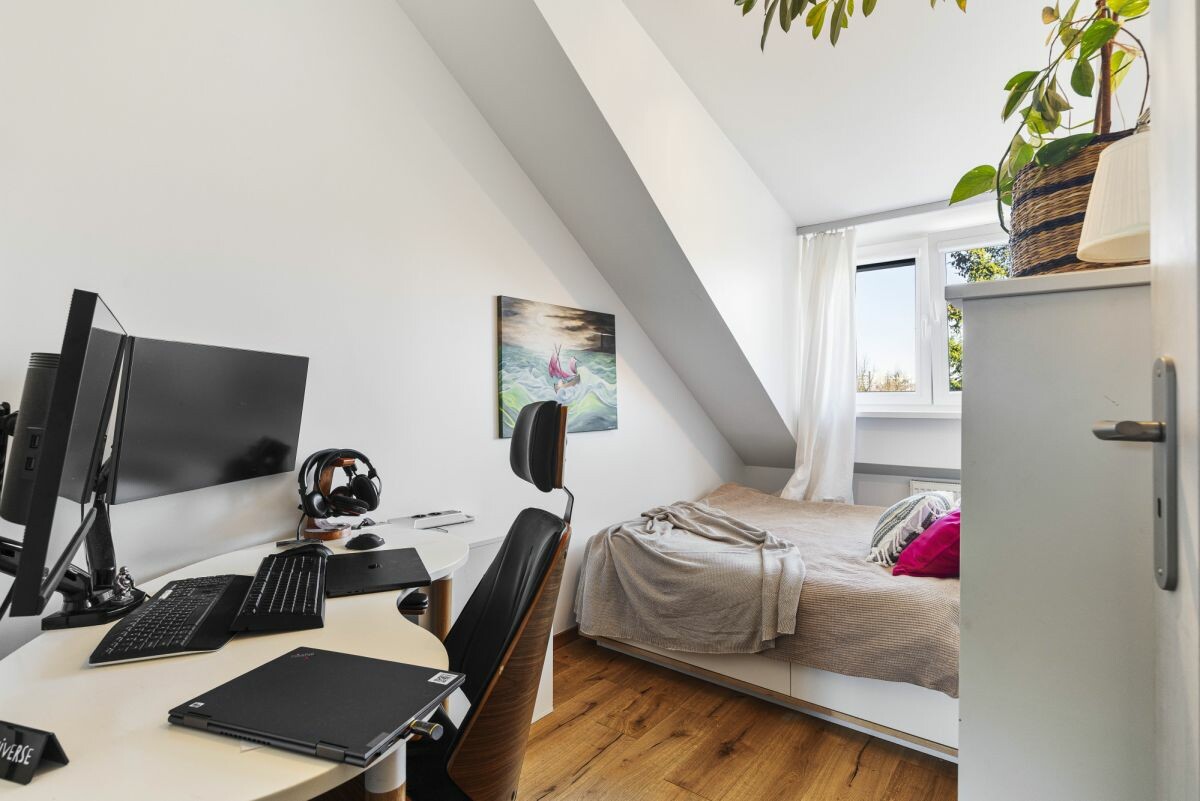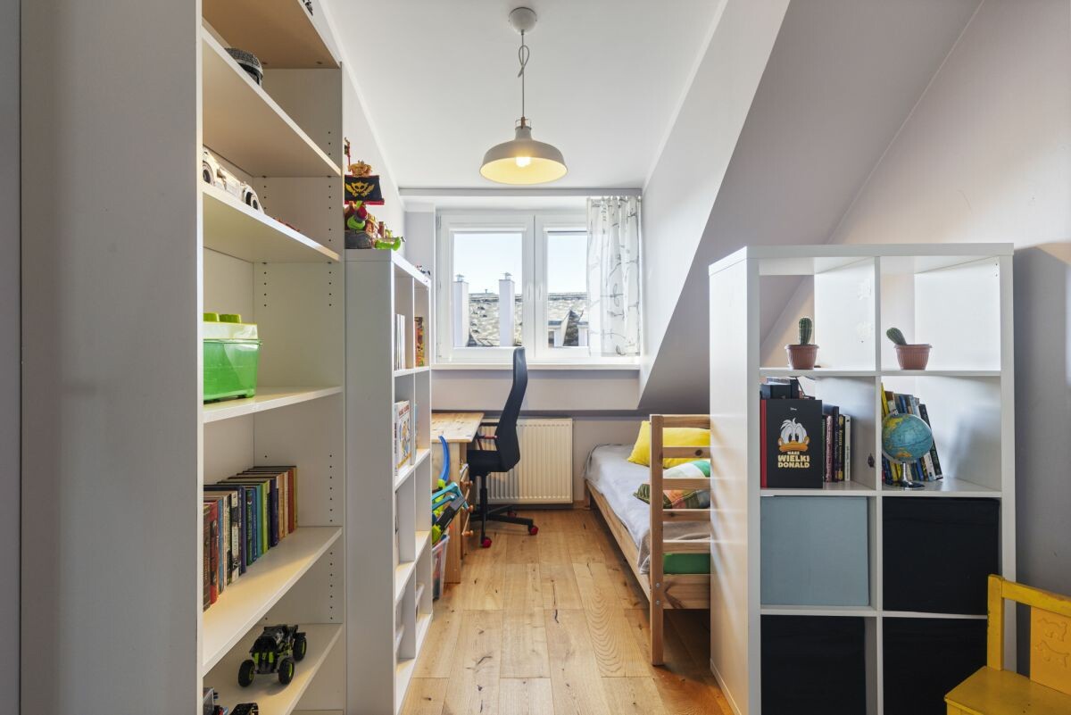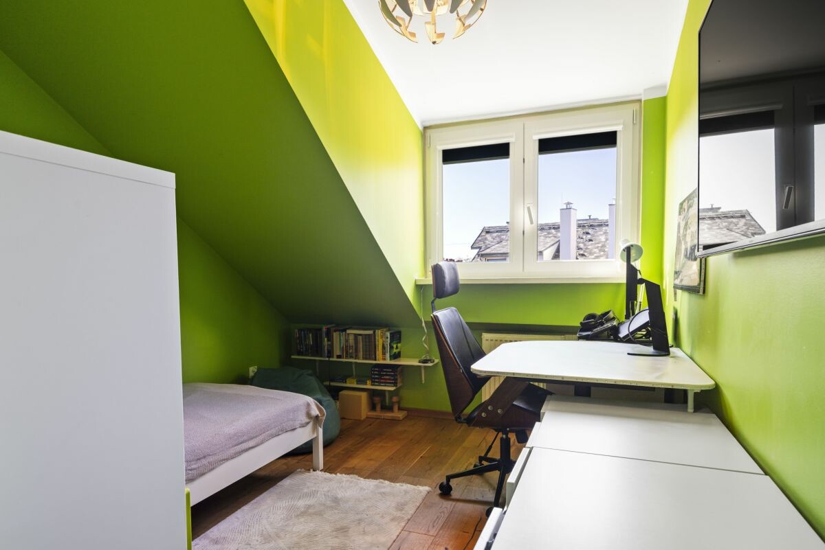 Mieszkanie o powierzchni całkowitej 110 m² (92,2 m² powierzchni użytkowej) usytuowane jest na ostatniej kondygnacji kameralnego budynku z 1997 roku. Inwestycja obejmuje jedynie 8 lokali, co gwarantuje poczucie prywatności i spokoju. Wejście do budynku zabezpieczone jest domofonem. Do nieruchomości przynależy miejsce postojowe w garażu podziemnym oraz komórka lokatorska. Na terenie osiedla dostępne są również dodatkowe miejsca parkingowe dla mieszkańców i gości.