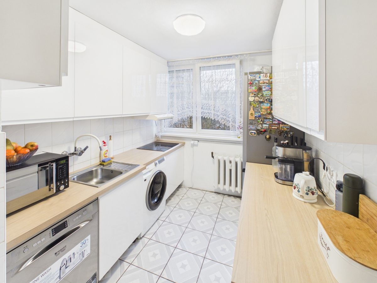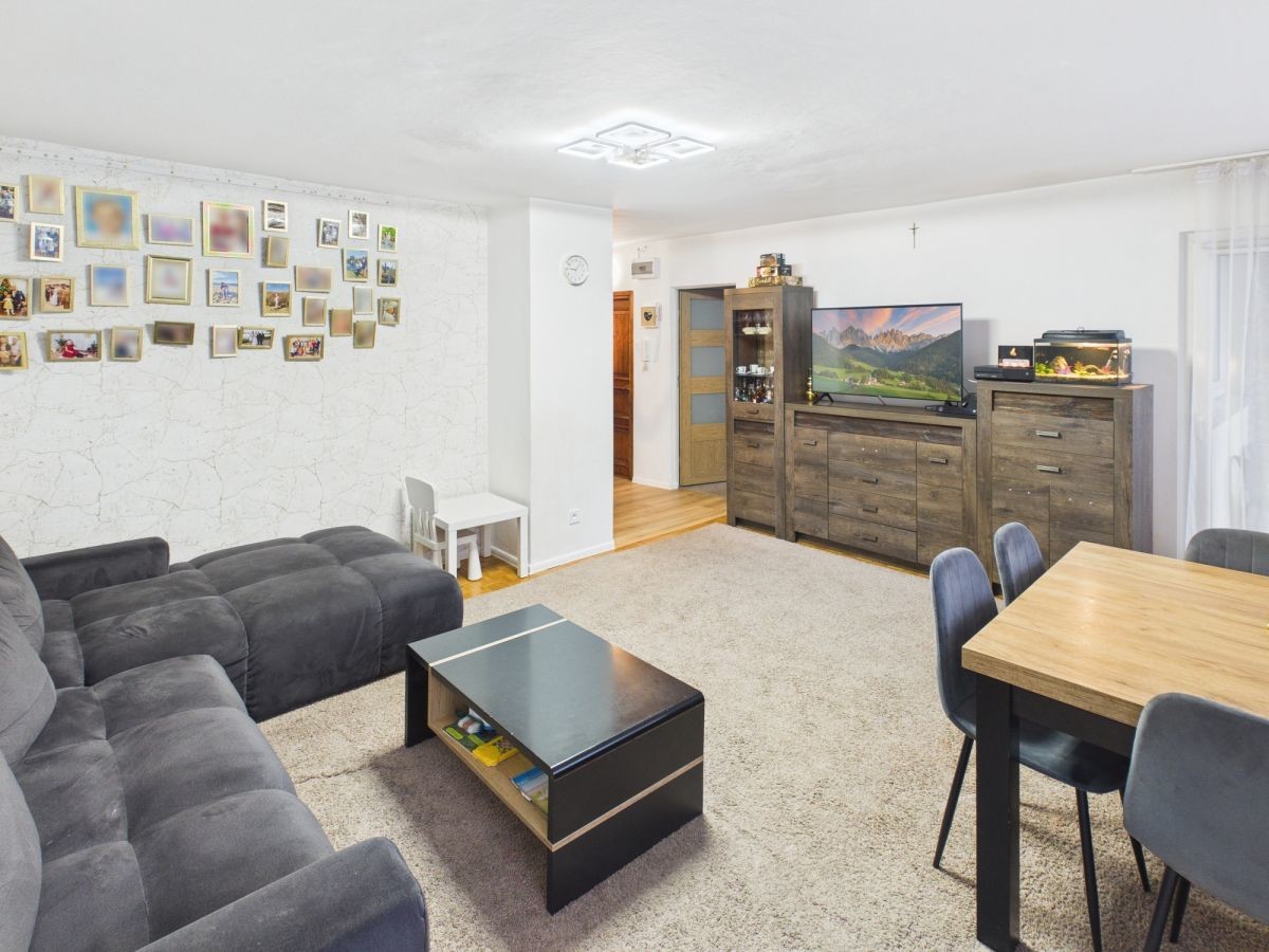 Mieszkanie o powierzchni 63,2 m2 znajduje się na ostatnim piętrze, 4 piętrowym bloku. Budynek jest ocieplony i regularnie konserwowany, aktualnie wymieniane są piony wodno-kanalizacyjne. Do mieszkania przynależy również piwnica. Teren osiedla jest zadbany, z dużą ilością zieleni.